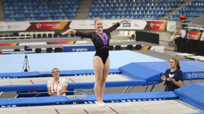 Luisa Braaf von den Frankfurt Flyers, die derzeit am Bundesstützpunkt in Bad Kreuznach trainiert und durch das dortige Trainer-Team im Wettkampf betreut wurde, zeigte drei saubere Übungen und präsentierte sich in guter Form. In einem stark besetzten Teilnehmerfeld erreichte sie am Ende den sechsten Platz.